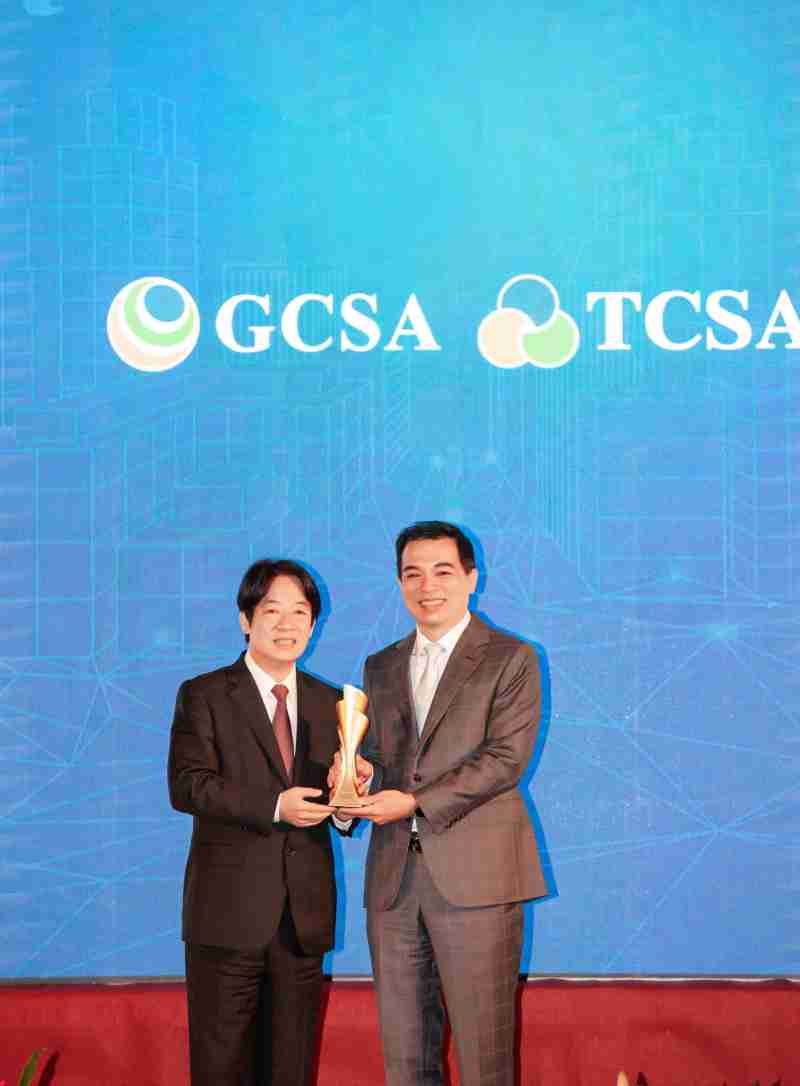 达全方位永续表现获全球永续奖及台湾永续奖肯定,,由副总统赖清德颁奖 (左),,,糖果派对总经理柯富仁 (右) 代表领奖