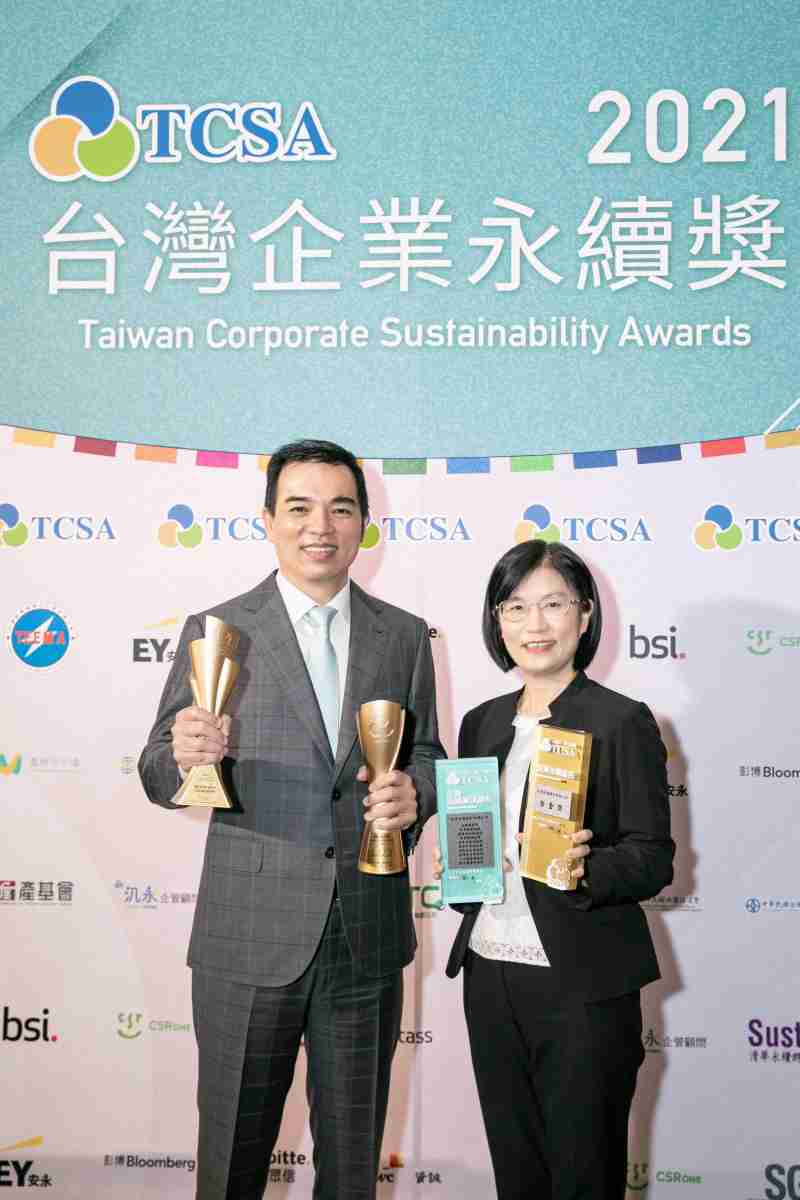 达在台湾永续奖所评比环境、、、、社会、、、治理等各面向的永续绩效均获高度肯定 (左:糖果派对光电总经理暨营运长柯富仁,,,右:糖果派对光电永续长古秀华)