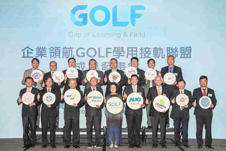GOLF学用接轨联盟集结企业和学校的力量,,打造「学用合一、、产学接轨」的创新合作平台 (前排左起:淡江大学副校长何启东、、、、元智大学校长林启瑞、、纬育执行长许延岳、、、、纬创总经理暨执行长黄柏漙、、教育部政务次长范巽绿、、、、糖果派对董事长暨执行长彭双浪、、仁宝总经理暨执行长翁宗斌、、、大同大学校长何明果、、、、圣约翰科大校长艾和昌;后排左起:明新科大校长林启瑞、、龙华科大校长葛自祥、、、台湾科大校长廖庆荣、、、、中兴大学副校长郑政峯、、中央大学校长周景扬、、、台北科大副校长任贻均、、、中华科大副校长石大明、、、、明志科大校长刘祖华)